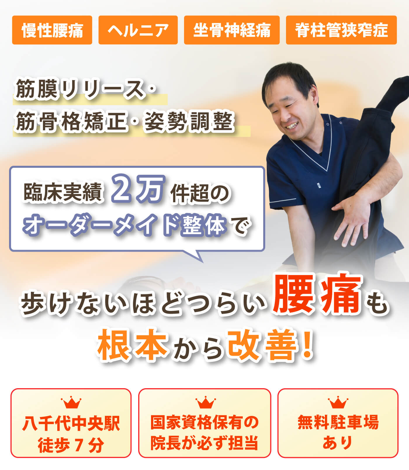 当院では、病院を含め、18年以上の施術歴と施術件数2万件以上の実績を持つ院長が必ず施術を担当いたしますので、一人ひとりに合わせたオーダーメイド整体が可能です。